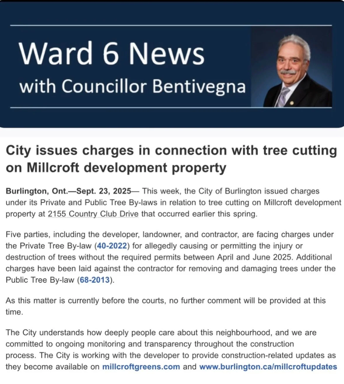 Burlington, Ont.—Sept. 23, 2025— This week, the City of Burlington issued charges under its Private and Public Tree By-laws in relation to tree cutting on Millcroft development property at 2155 Country Club Drive that occurred earlier this spring.