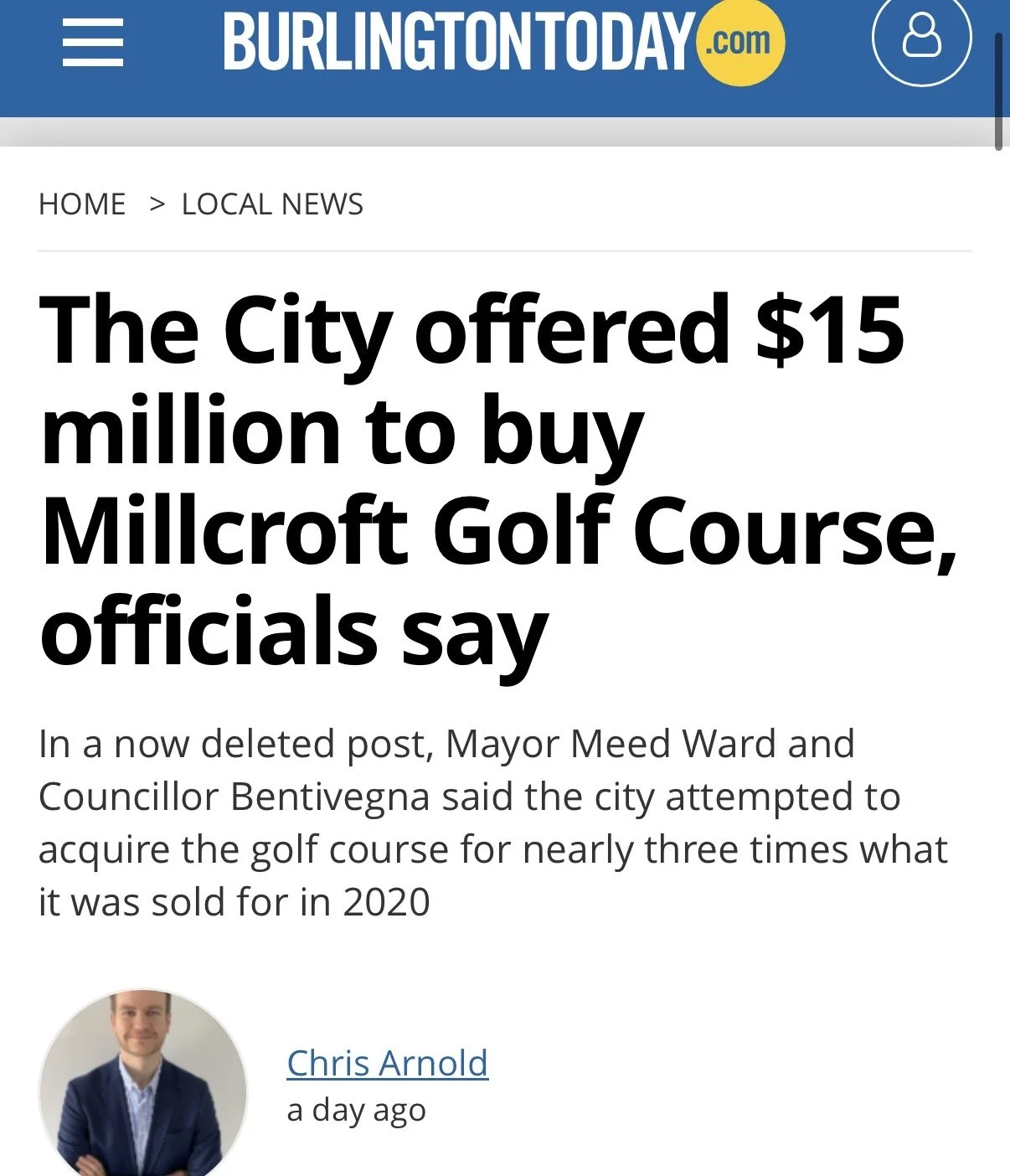 The City of Burlington offered to acquire Millcroft Golf Course for $15 million, according to a statement released on social media by mayor Marianne Meed Ward and Ward 6 councillor Angelo Bentivegna.