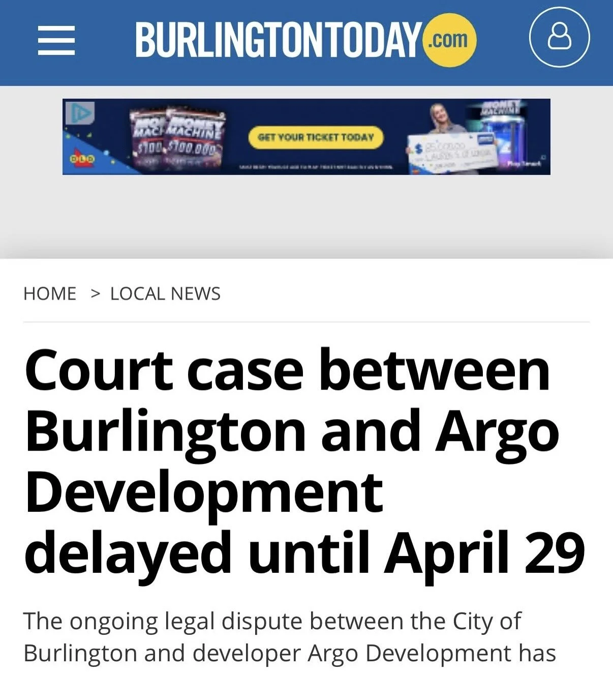 The ongoing court battle between the city of Burlington and Argo Development is on hold until April 29.